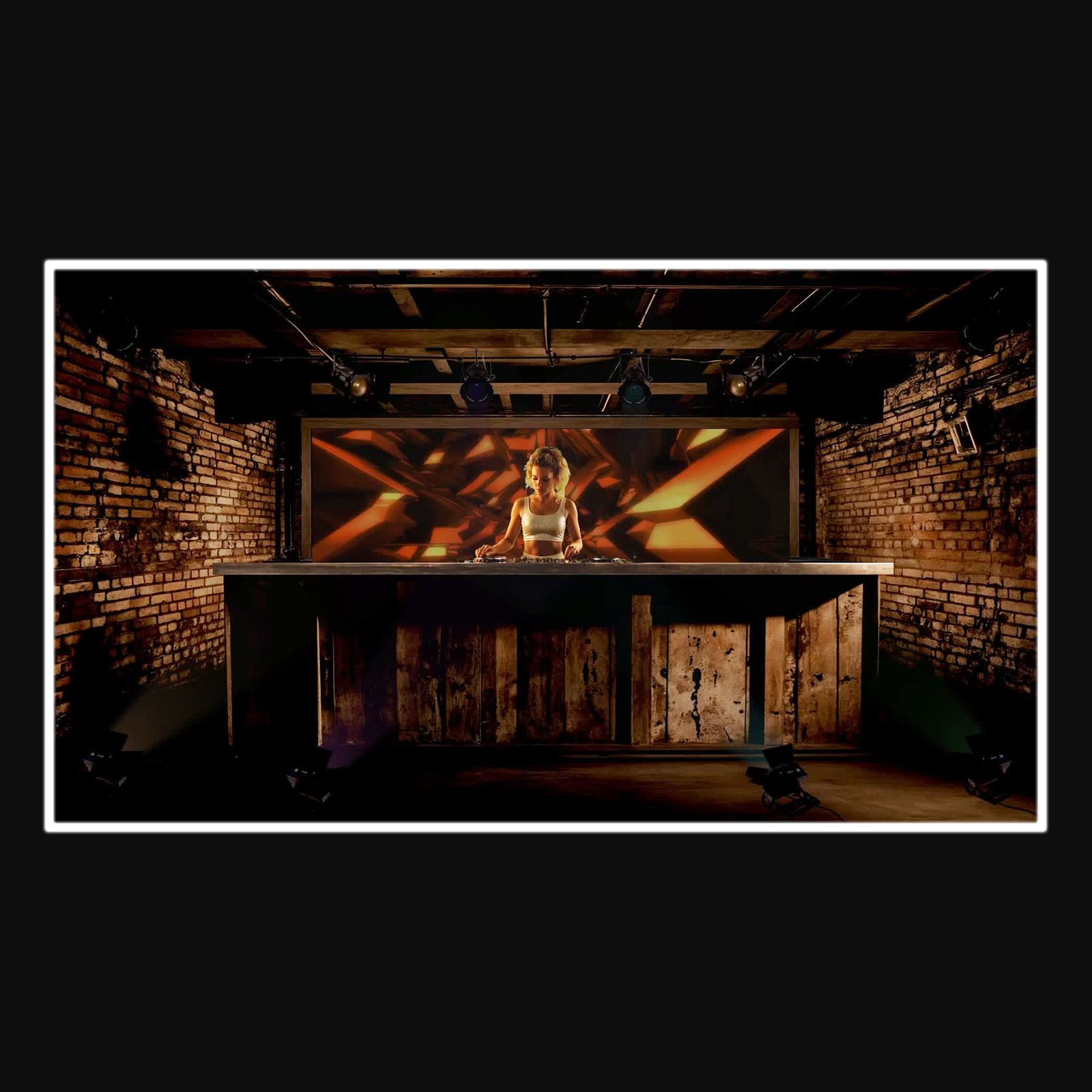 Industrial-style with a large screen display. Modern lighting fixtures and exposed wooden beams on the ceiling with along wooden counter and brick walls, moody and energetic atmosphere.