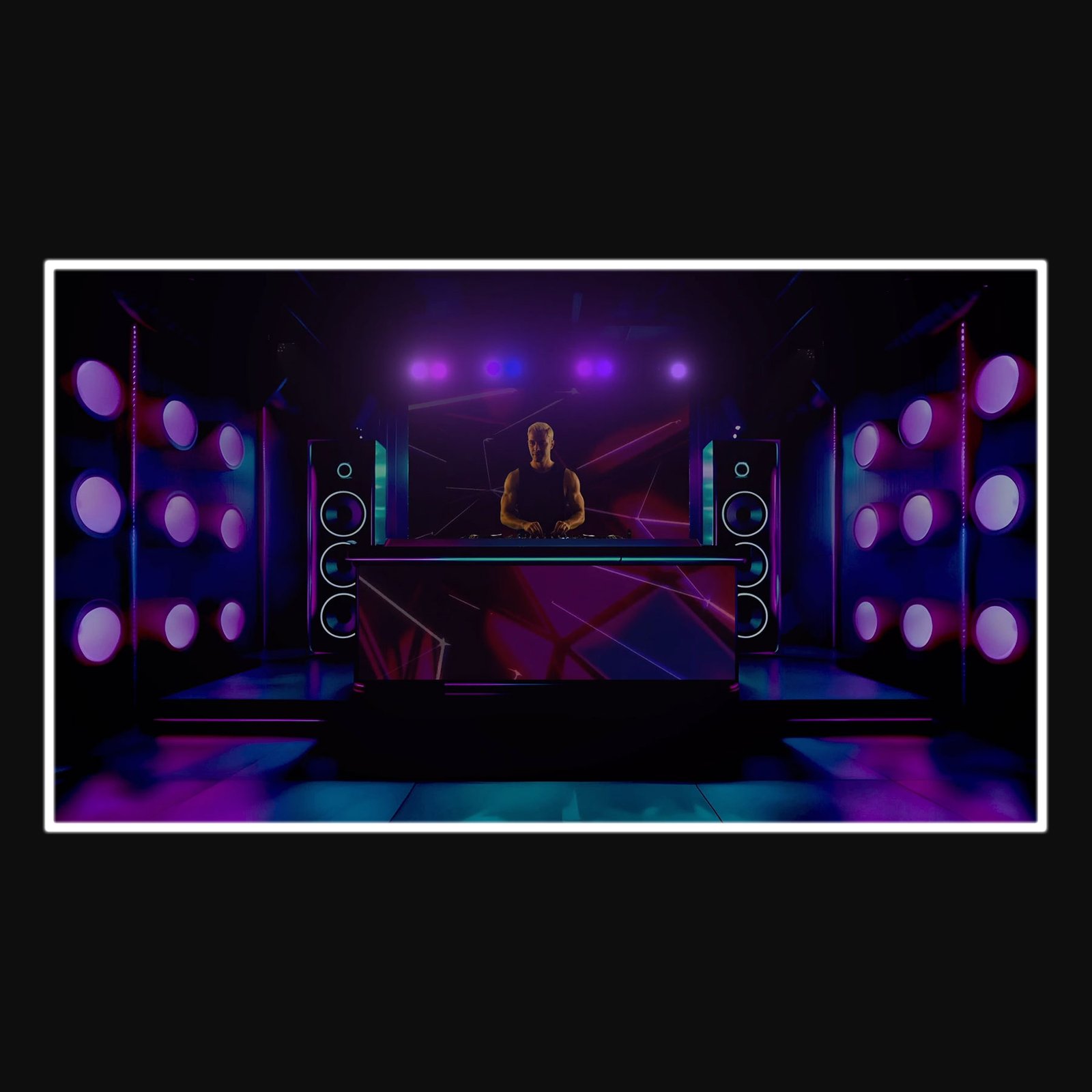 Vibrant vibe stage, creating a dynamic and immersive atmosphere. Dance club style with big speakers and colorful strobes lights.