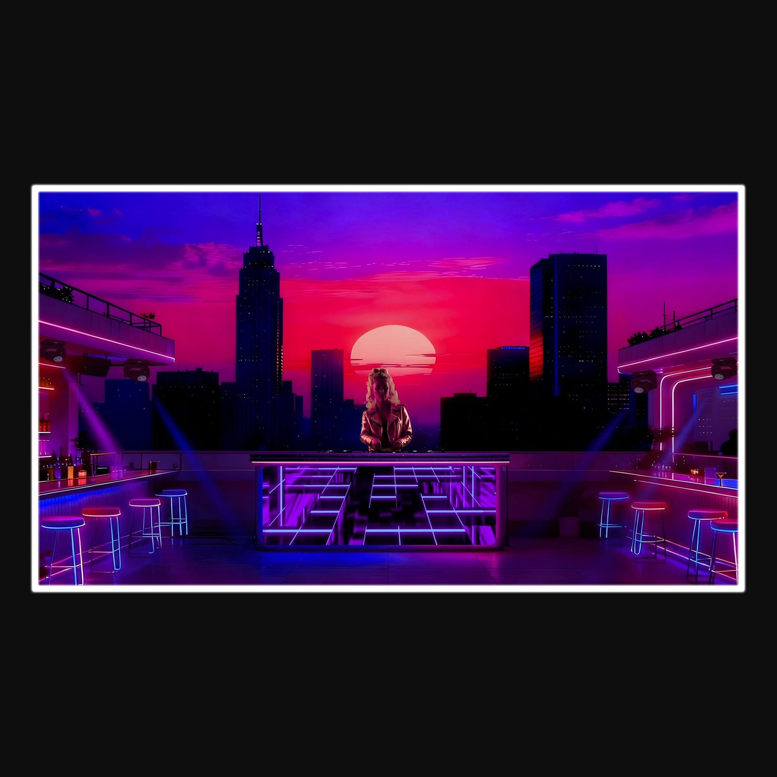 Rooftop bar with city landscape, neon lights in a synthwave retrowave style for a energetic atmosphere.